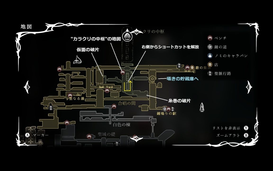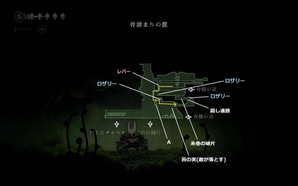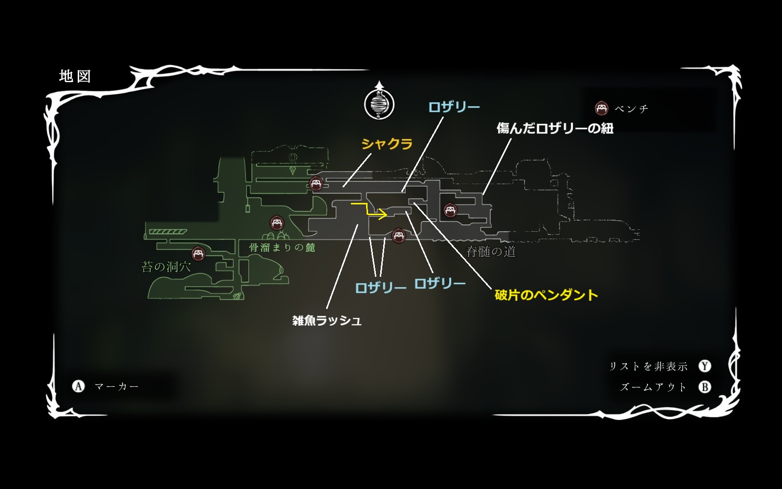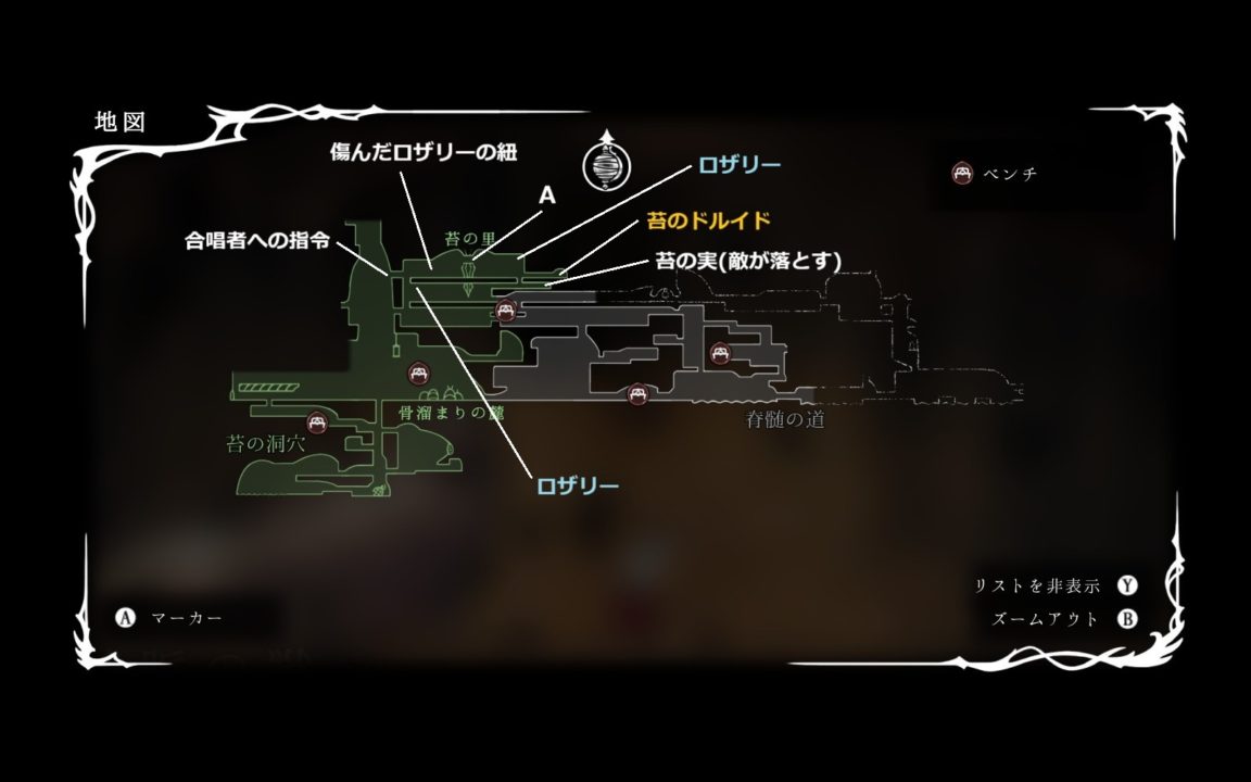 糸巻の破片を入手したら左奥でロザリーを回収してから右上に行って、脊椎の道のベンチへ。