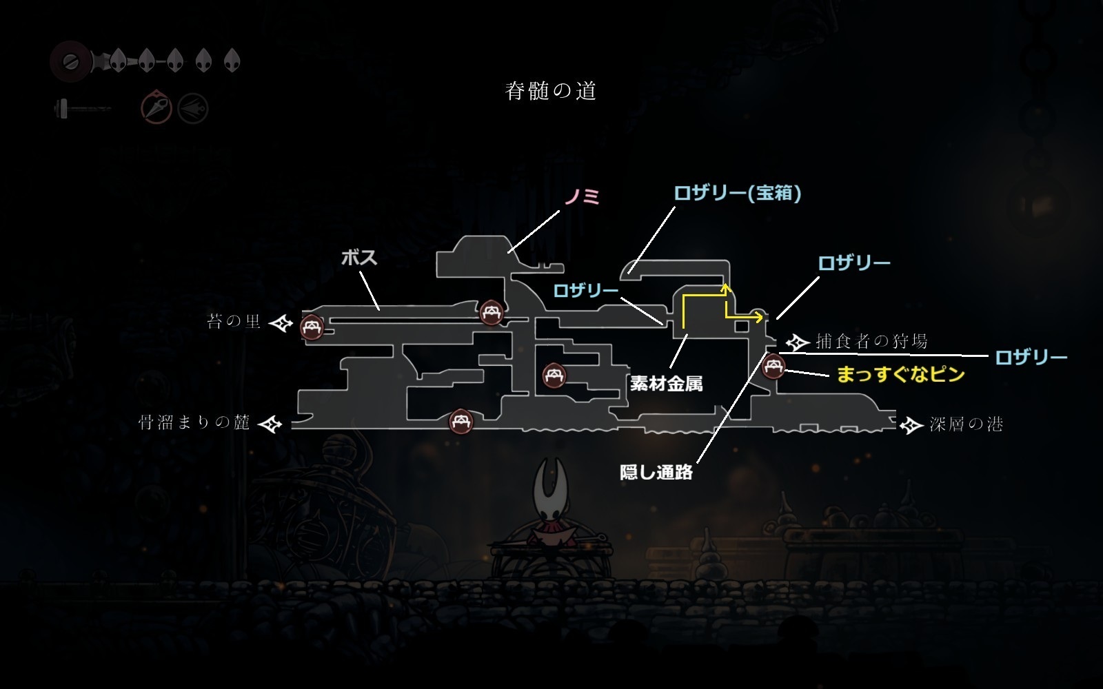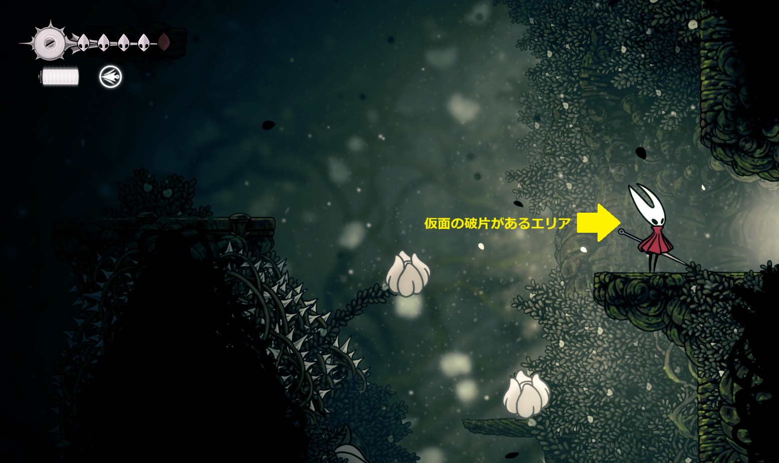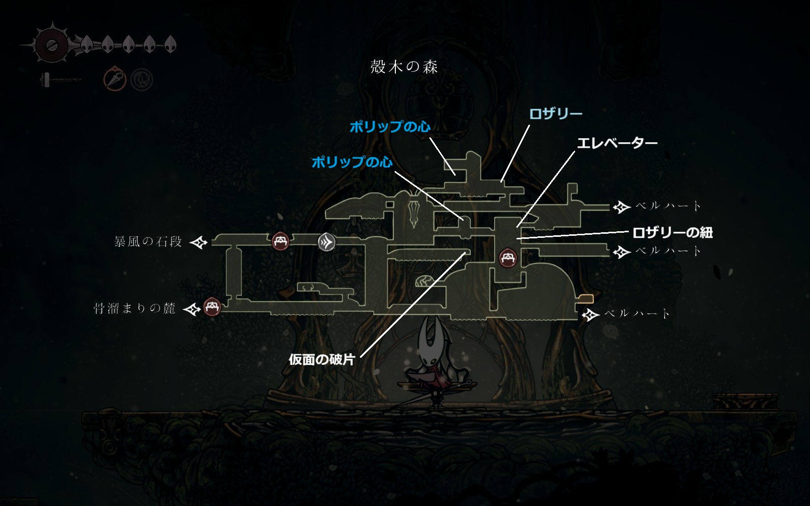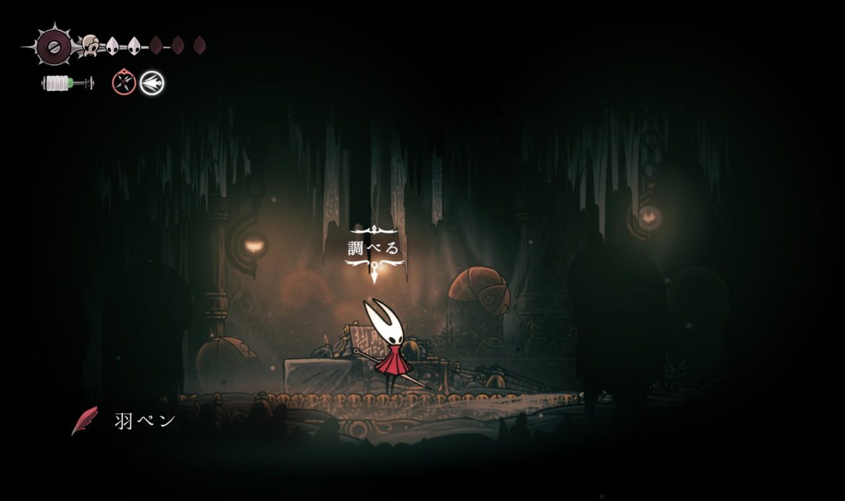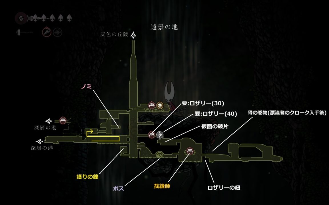 ※仮面の破片や糸巻の破片は無視(もし地中の穴、囁きの貯蔵庫、ペブの店の仮面の破片を入手してライフ7を目指すなら取りにいく)