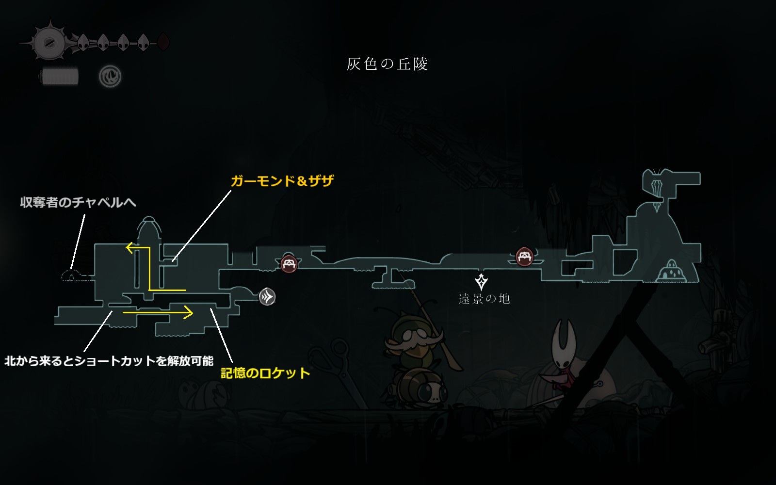 記憶のロケットを回収後、シルクの銛が必要な場所から下部の洞窟に降りて、洞窟の途中を左に行った先からガーモンド&ザザの場所を目指す。