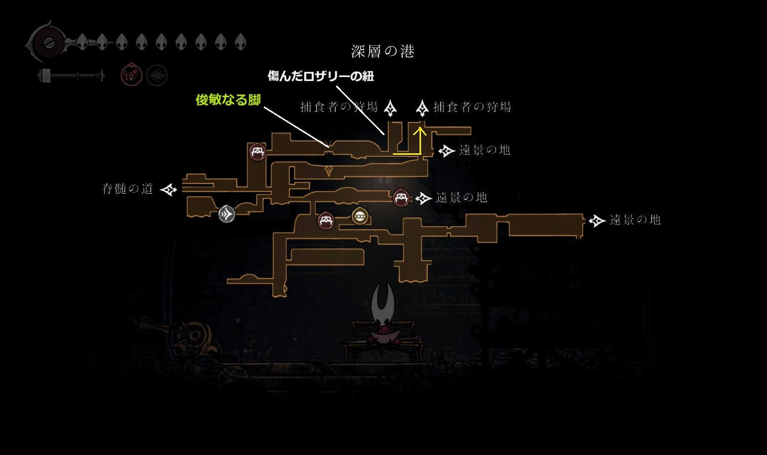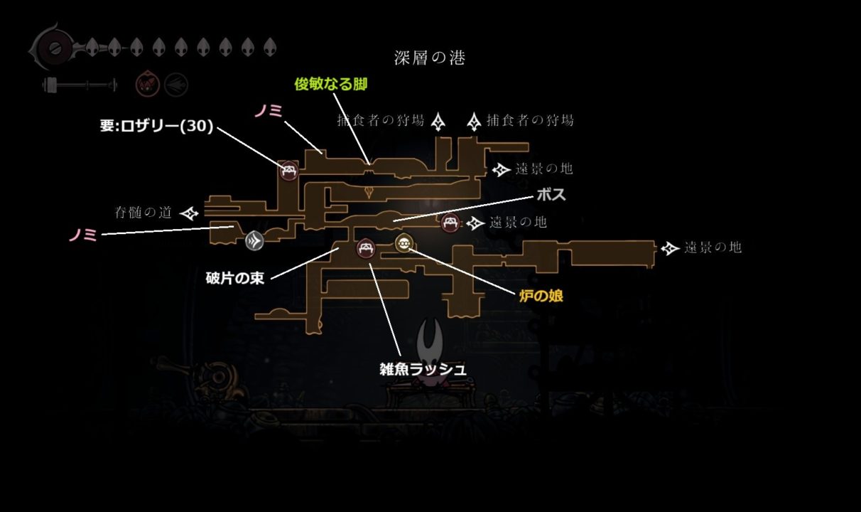 南で雑魚ラッシュを突破した先から深層の港に入り、俊敏なる脚の取得に向かう。