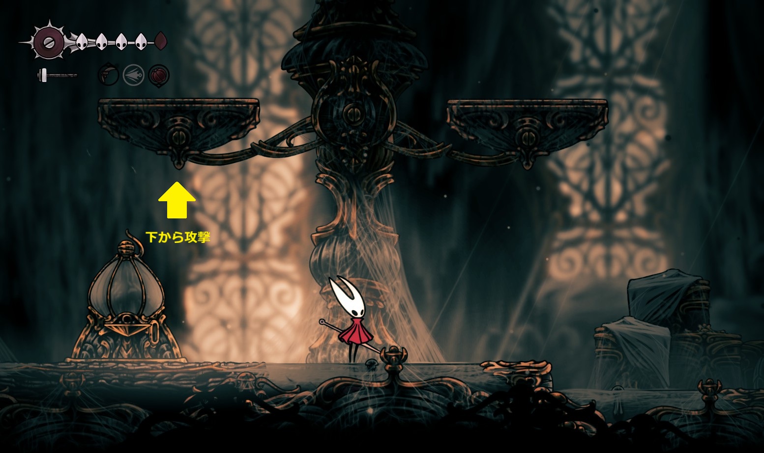 天秤を下から攻撃して動かすことで、上に登っていける。