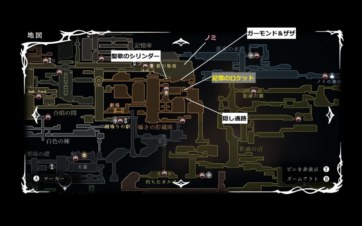 初来訪時にガーモンド&ザザは現れないので、奥で聖歌のシリンダーを入手したら左上の囁きの貯蔵庫の地図があるところから歌の集落に出てベンチで休む。