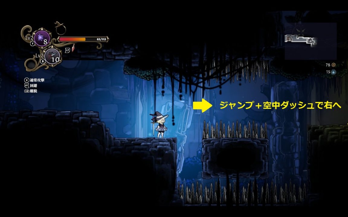 バネを利用して登っていくエリアの最上部では、バネを利用した大ジャンプ+離脱(帽子状態になる)を利用しないと上に登れない。
