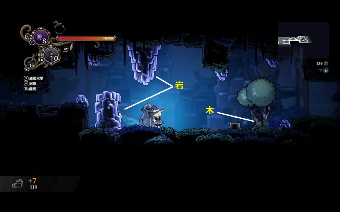 ダンジョン内にある岩や木を攻撃して破壊すると石材や木材を入手できる。