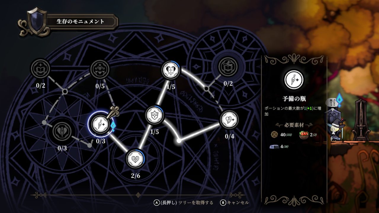 生存のモニュメントでは素材を消費することで生存に関わる永続の強化効果を習得できる。