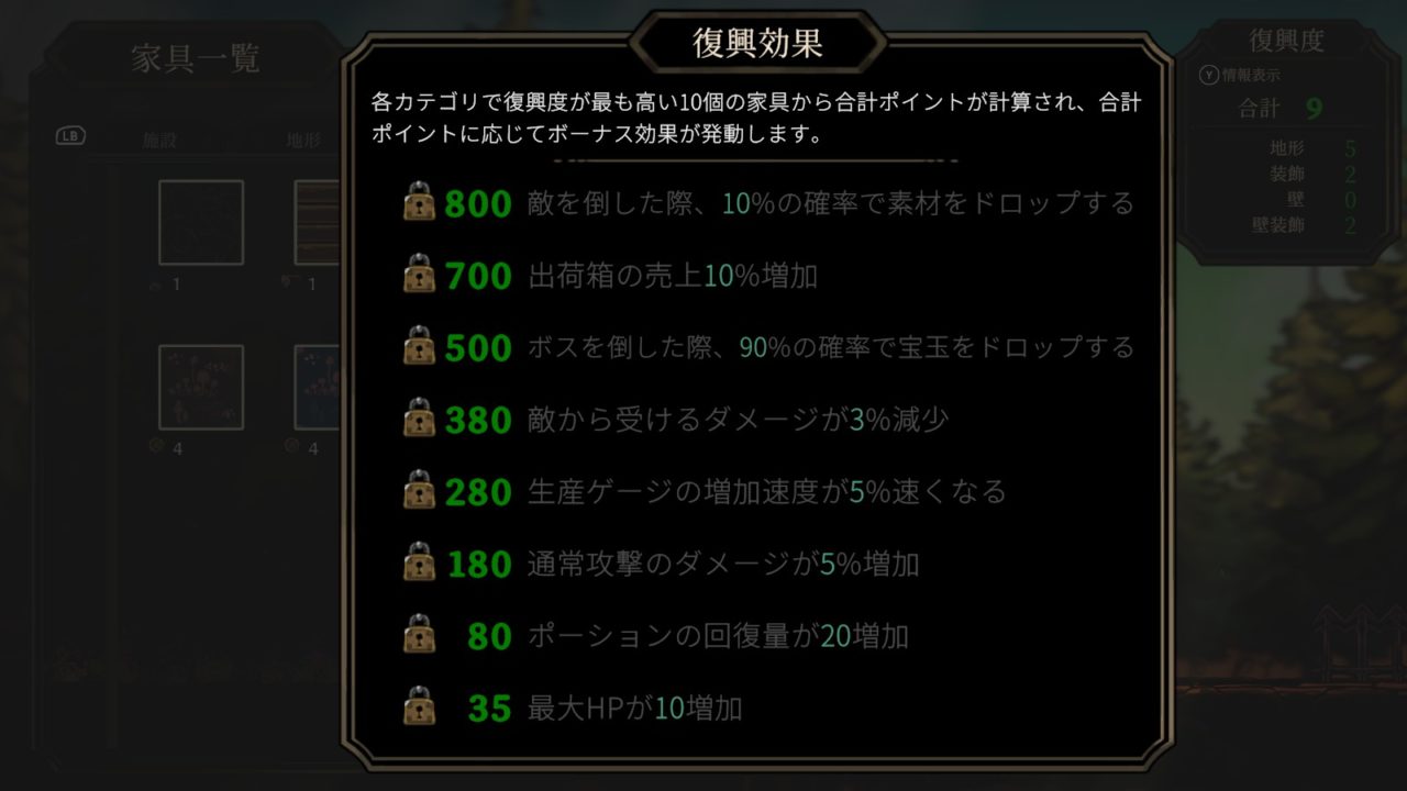 各カテゴリで復興度が最も高い10個の家具から復興度の合計ポイントが計算される。