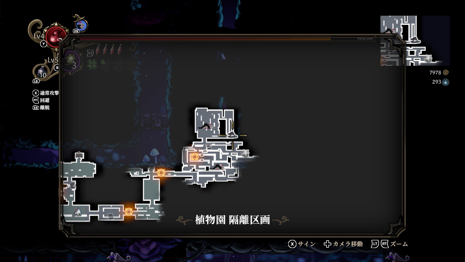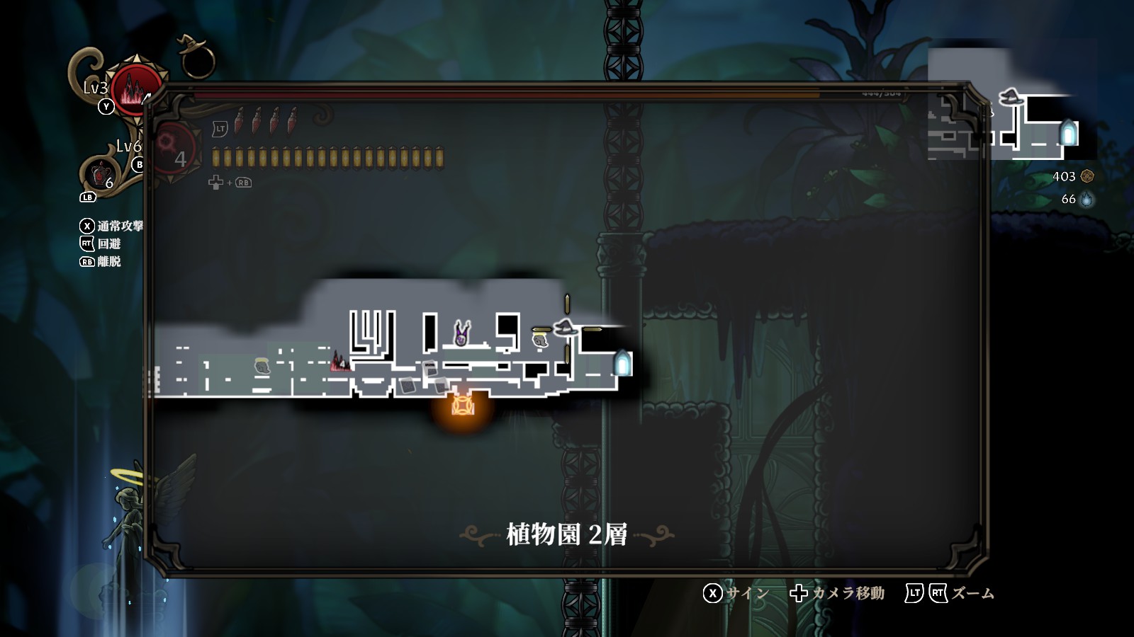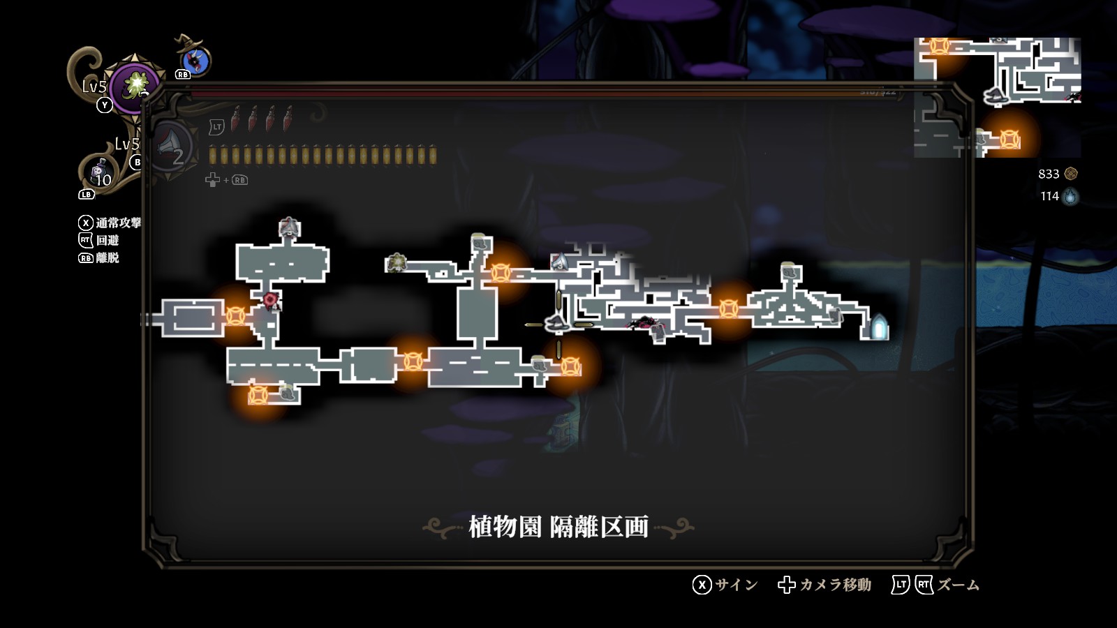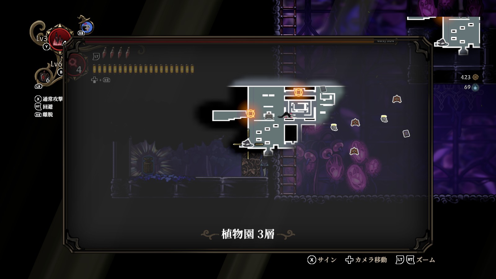 | 植物園 1層 | 捕獲檻でボーンドッグに憑依した状態で植物園に入り、1層の東端の上部に登る。 そこでボーンドッグに憑依して左にジャンプし、紫のギミックを攻撃しながら左の足場まで移動する ※地図上の位置 | ![]() |