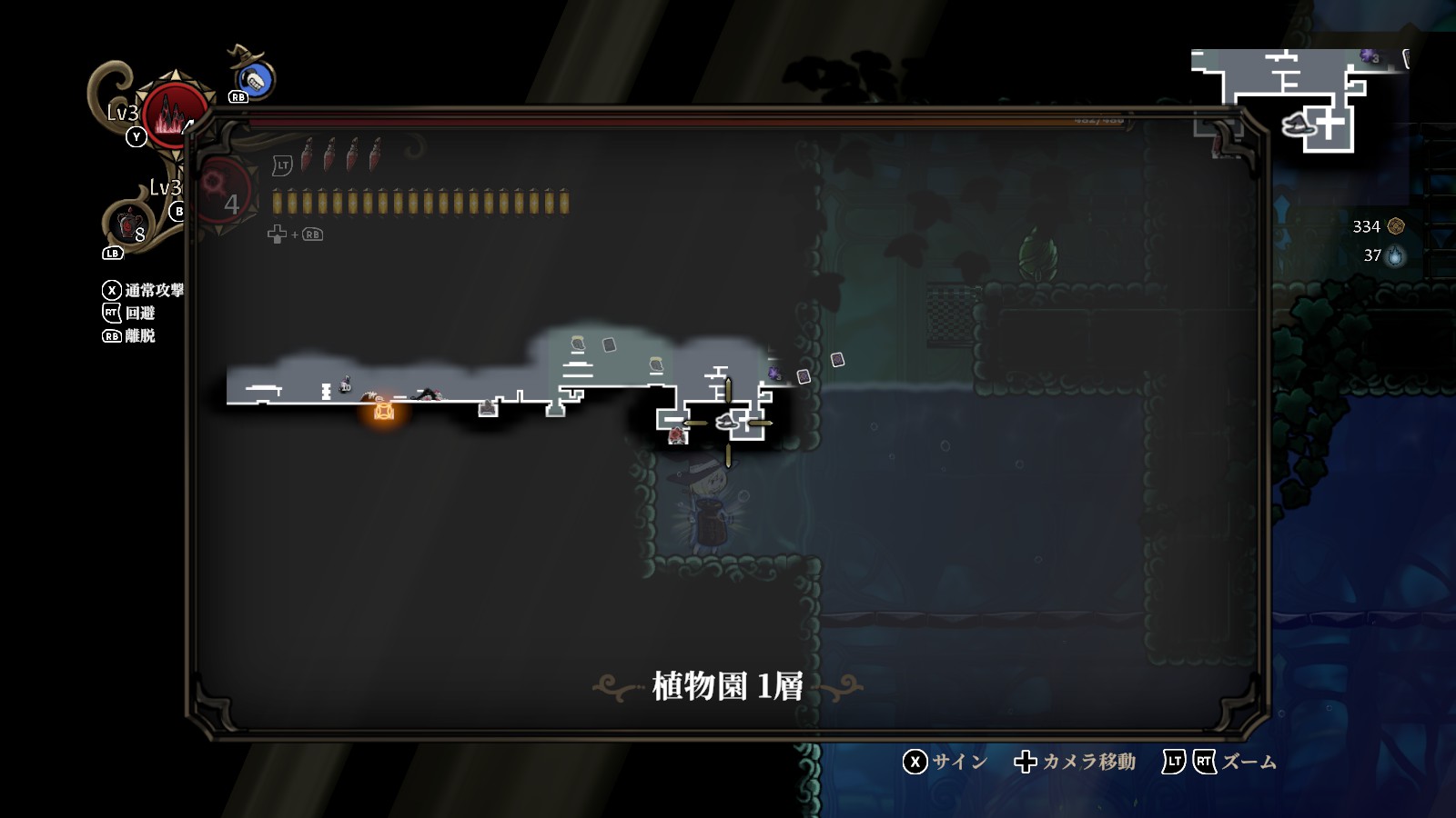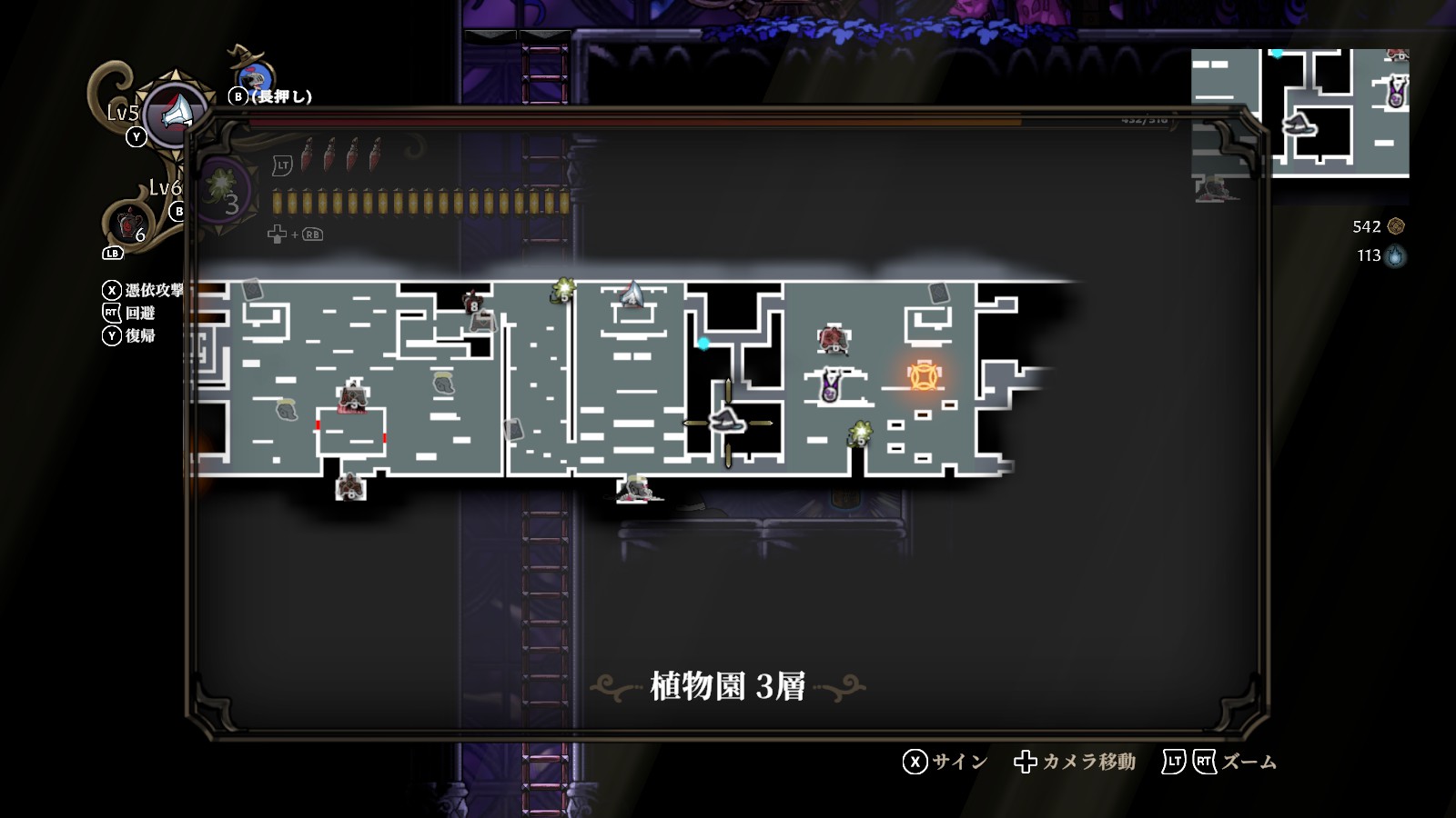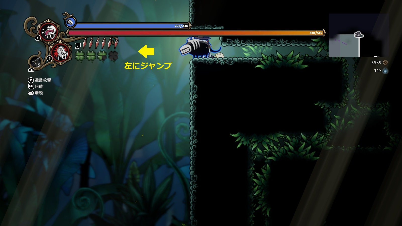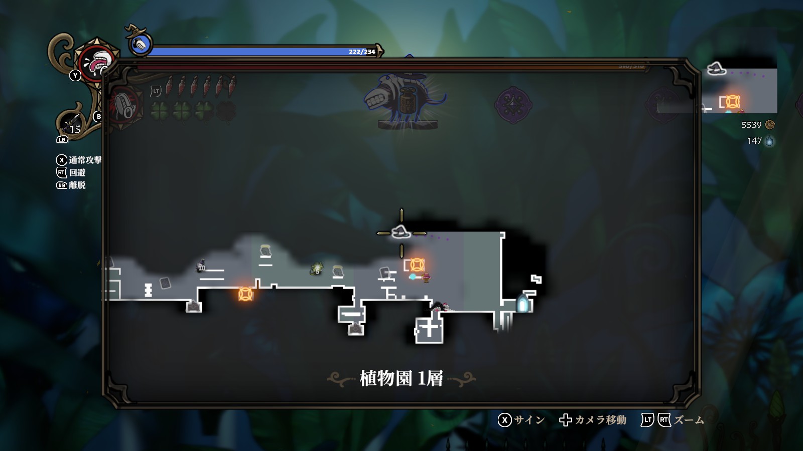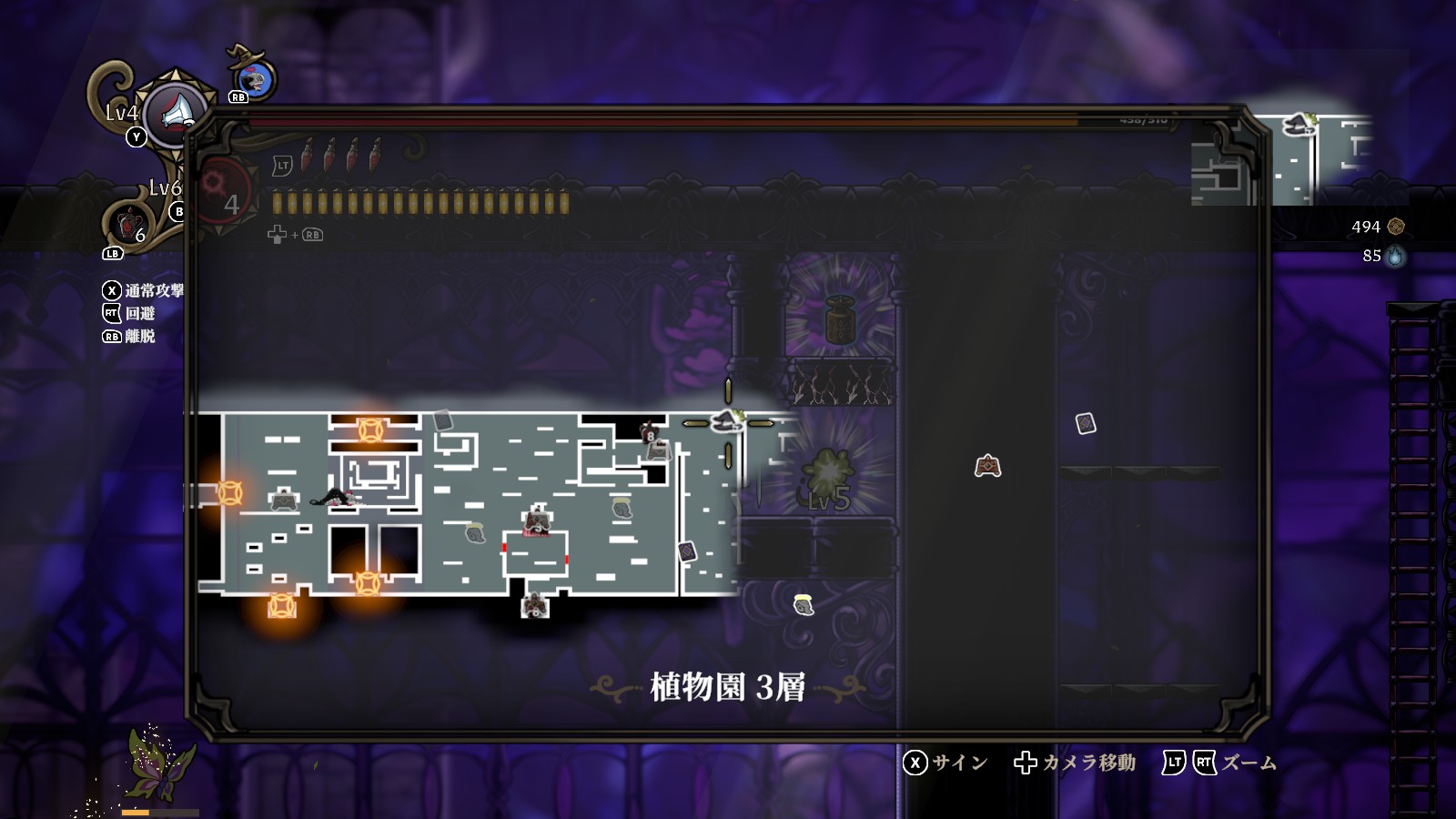 | 植物園 1層 | 捕獲檻でボーンドッグに憑依した状態で植物園に入り、1層の東端の上部に登る。 そこでボーンドッグに憑依して左にジャンプし、紫のギミックを攻撃しながら左の足場まで移動する ※地図上の位置 | ![]() |
