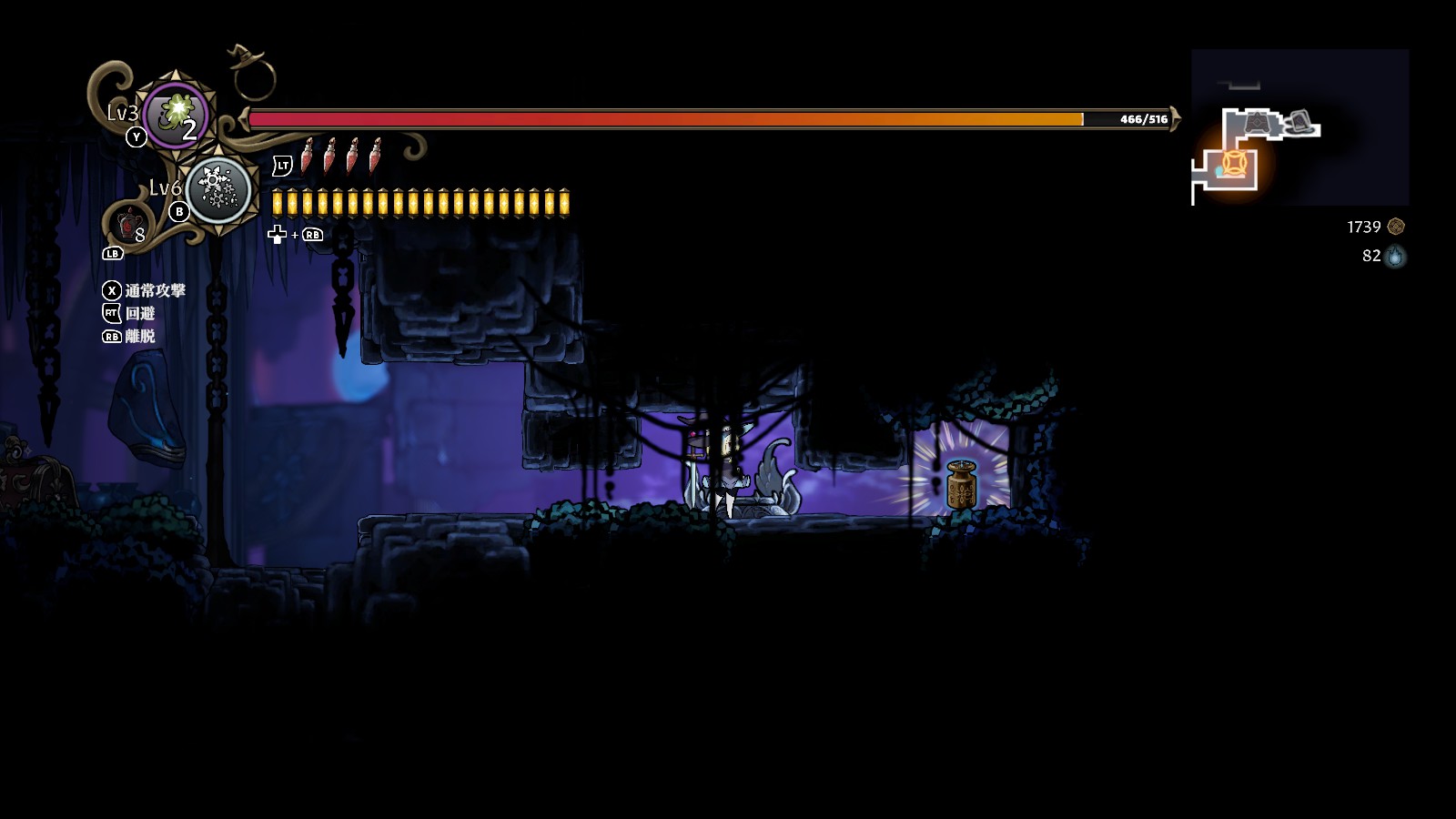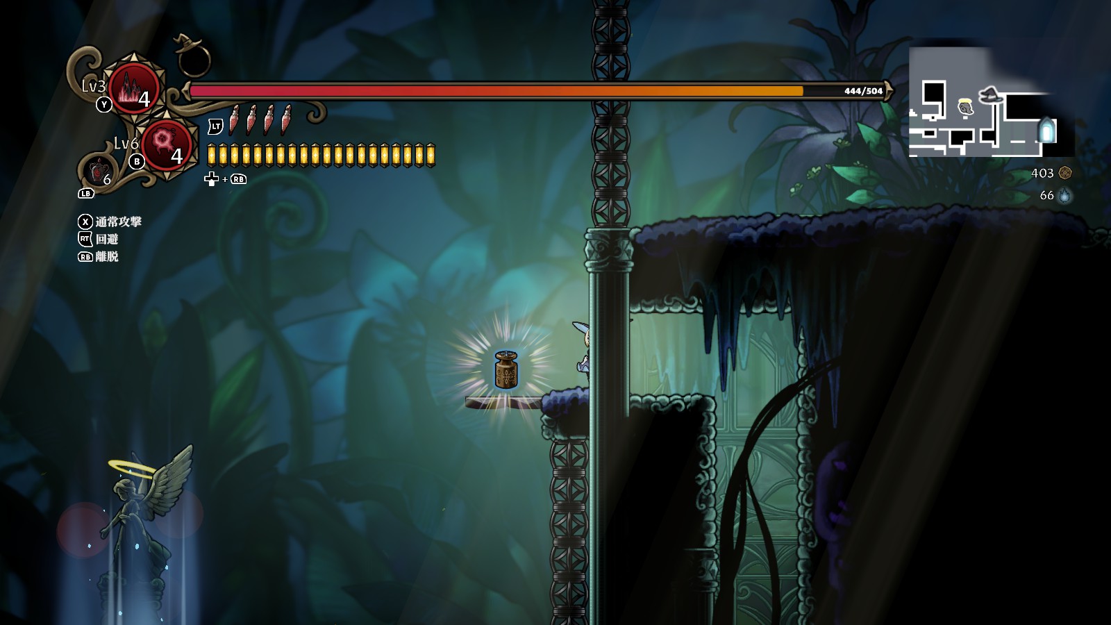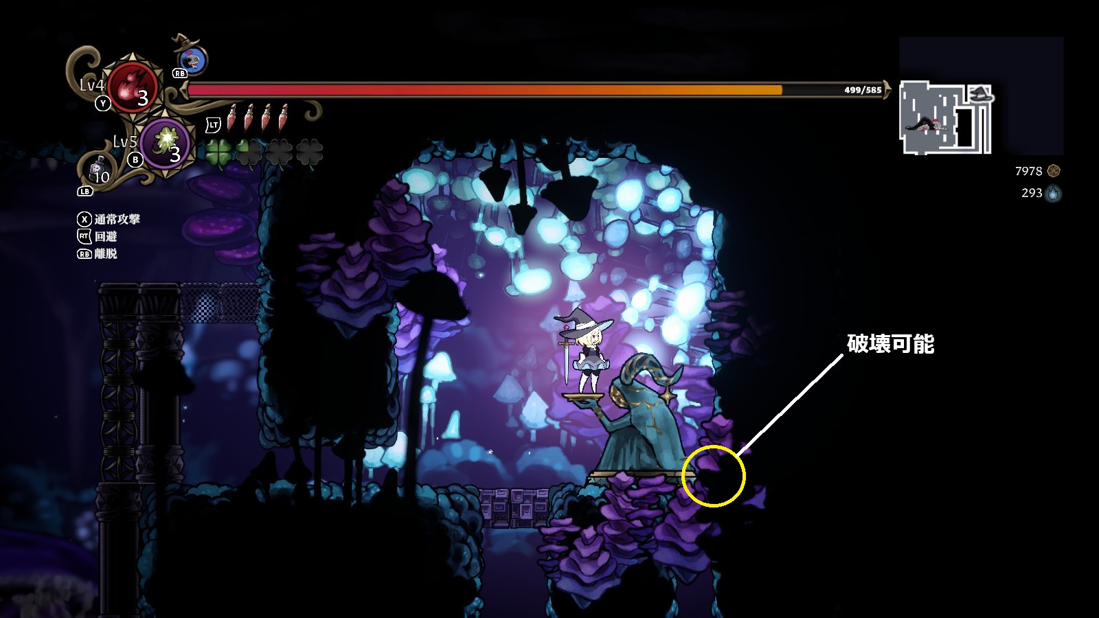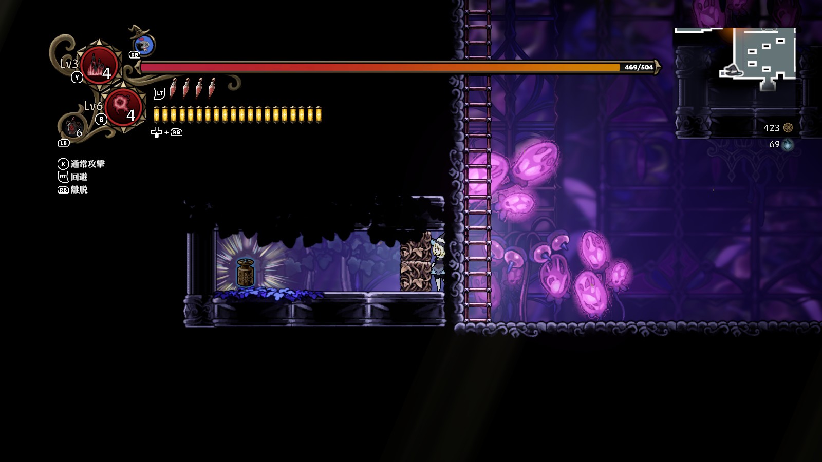 | 植物園 1層 | 捕獲檻でボーンドッグに憑依した状態で植物園に入り、1層の東端の上部に登る。 そこでボーンドッグに憑依して左にジャンプし、紫のギミックを攻撃しながら左の足場まで移動する ※地図上の位置 | ![]() |