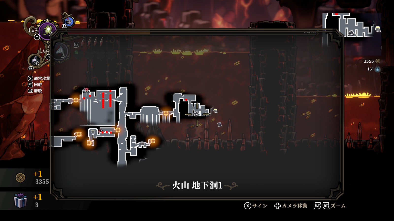 | 火山 3層 | 学院のアーティファクト「金色の風車」とミノタウロスへの憑依が必要(足元はジャンプ攻撃) ミノタウロスは3層内に1体はいるはず ※地図上の位置 | ![]() |