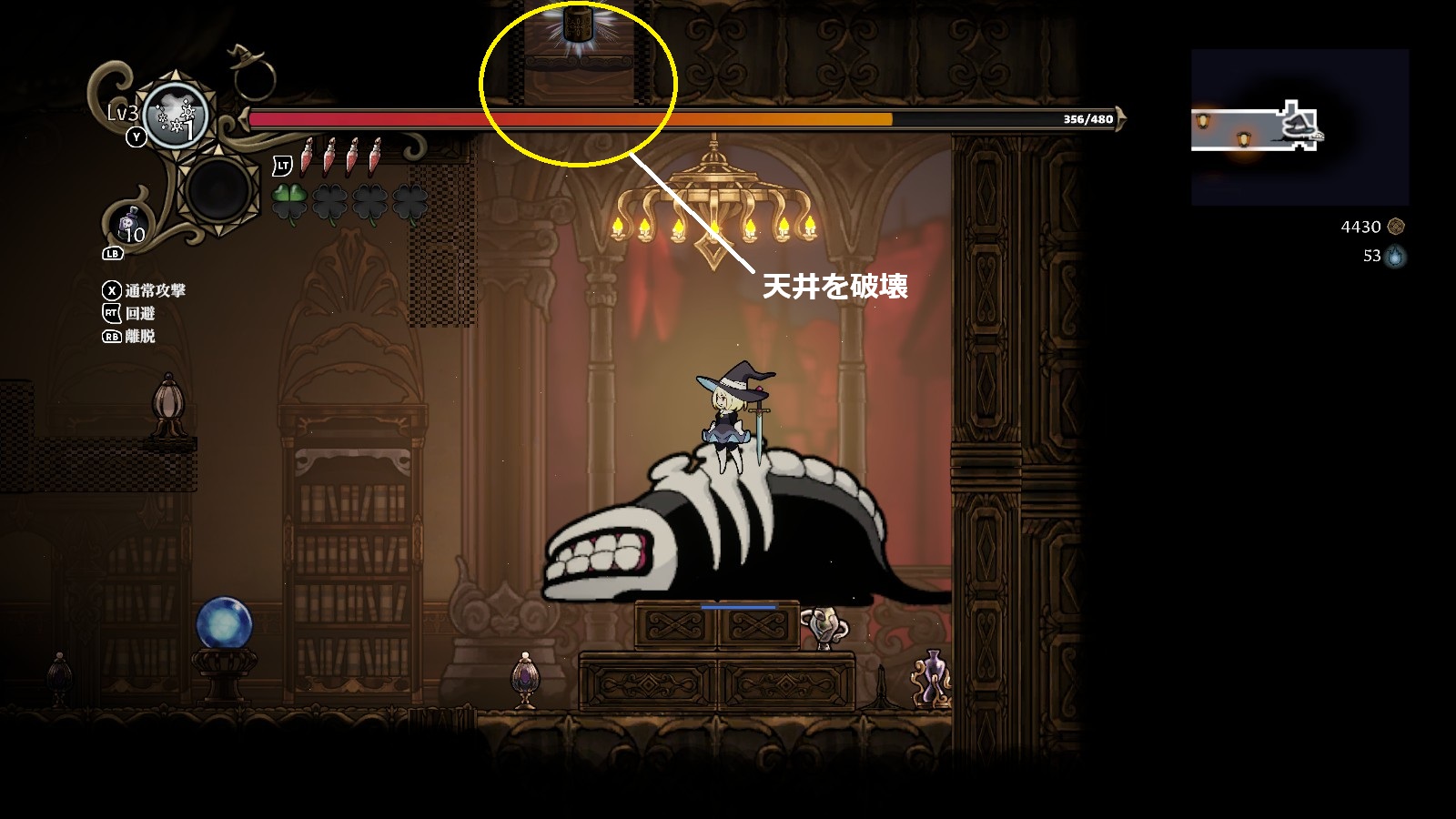 | 学院 1層 | グリーンアンブルの設計図があった場所の左上の天井を巨大なボーンドッグに憑依した状態で破壊可能 ※地図上の位置 | ![]() |