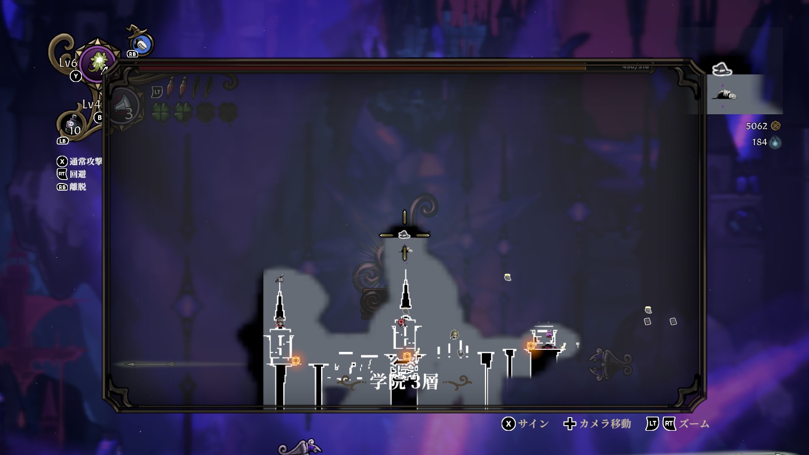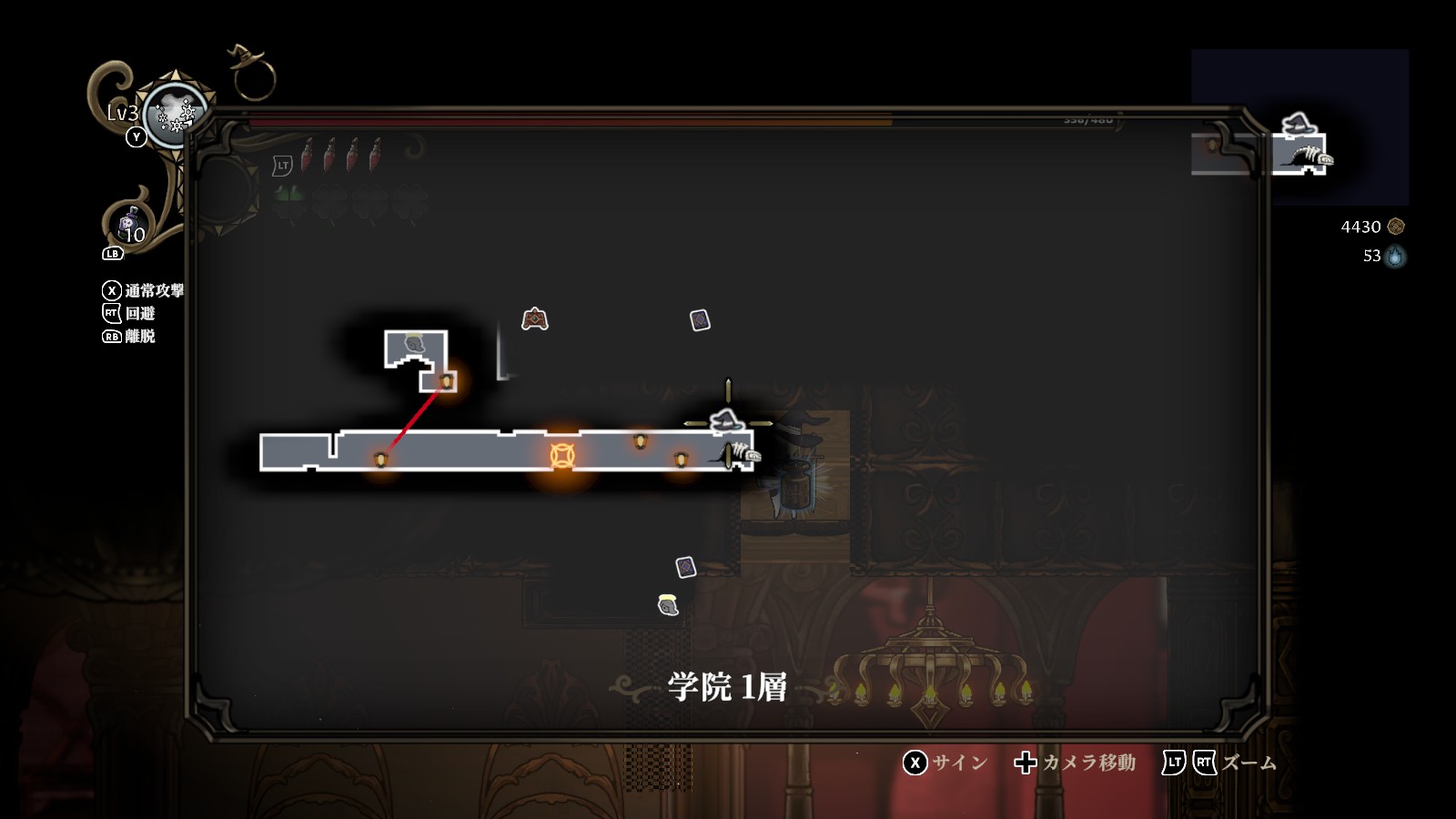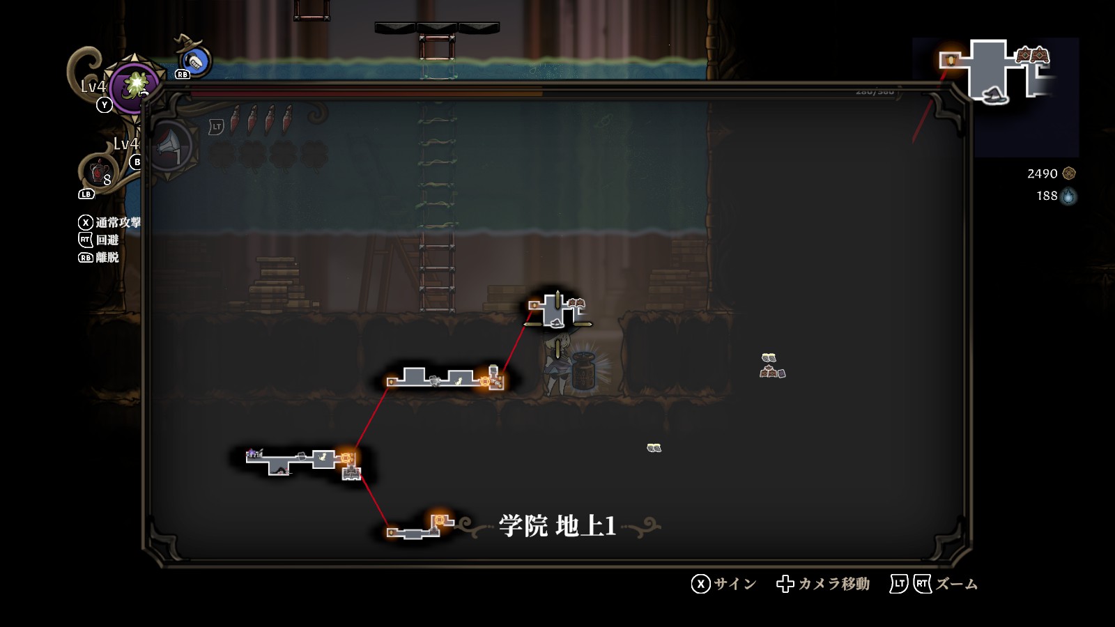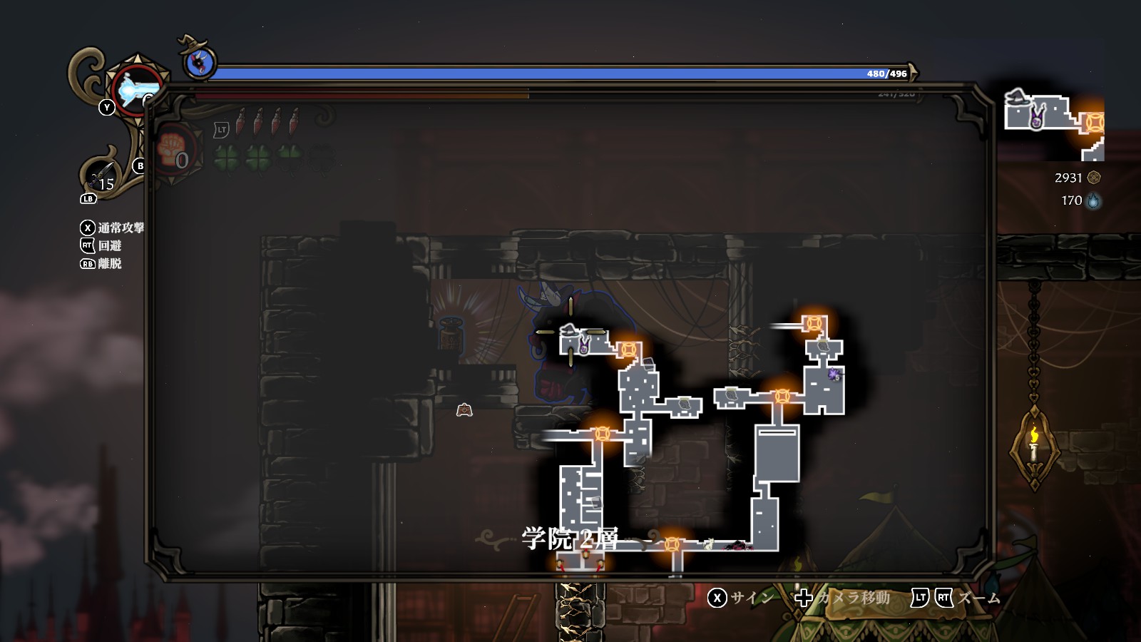 | 学院 3層 | ボーンドッグに憑依した状態のジャンプ攻撃で上に登っていく(ボーンドッグは3層内にもいるはず) ※地図上の位置 | ![]() |