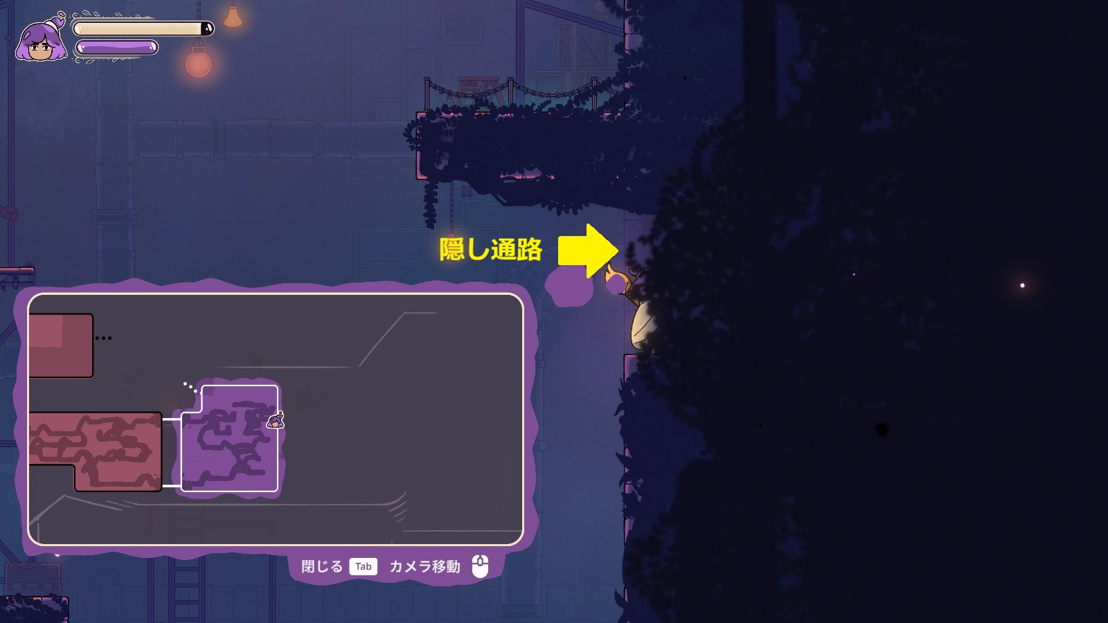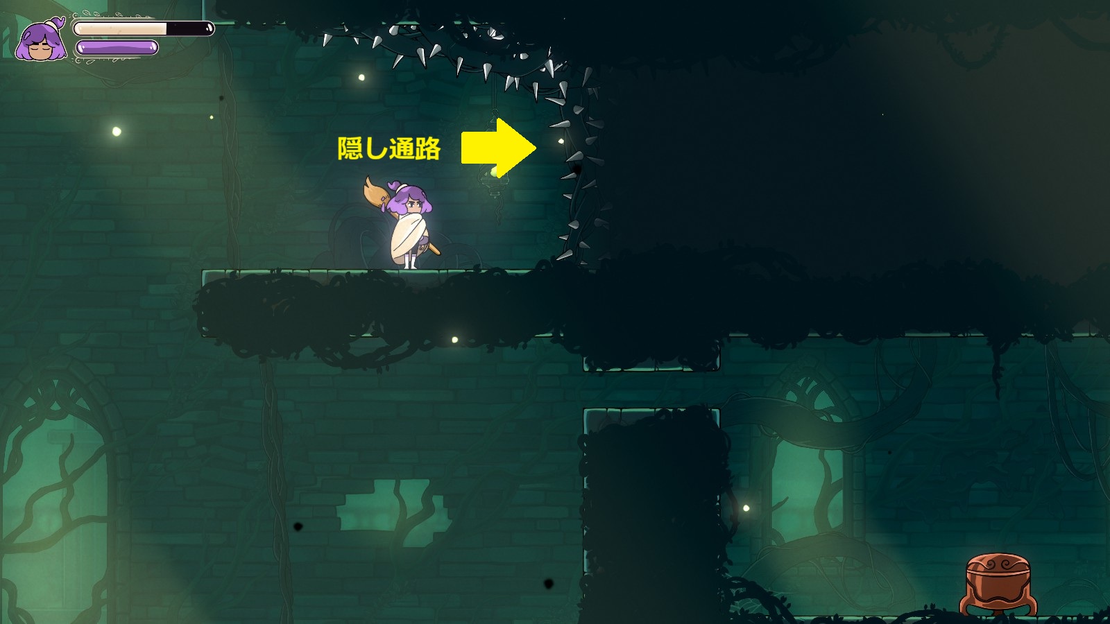 A:宝箱が見えている場所の少し上の茨のところにダイブダッシュで通れる隠し通路がある