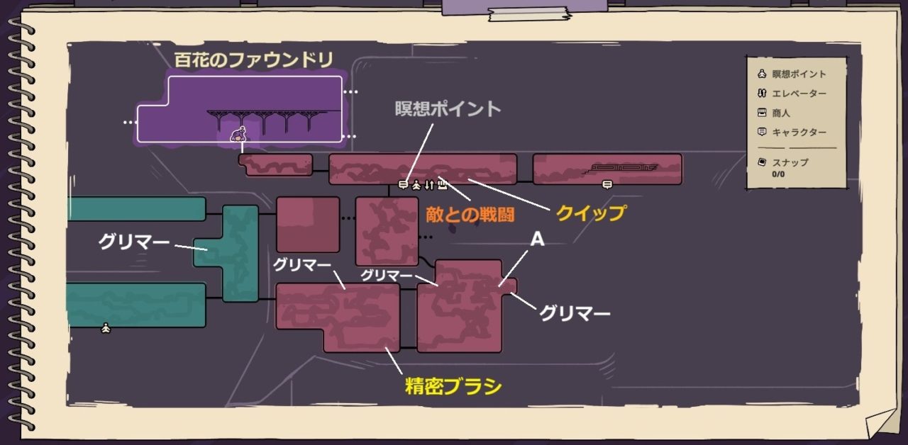更に右に進むと瞑想ポイントのあったエリアに戻ってくる。このエリアの右上の茨を通ってクイップと会話をすると「マップ」を貰える。