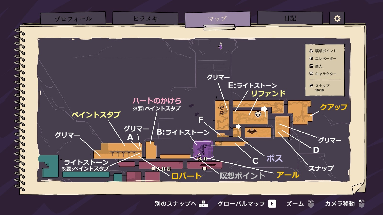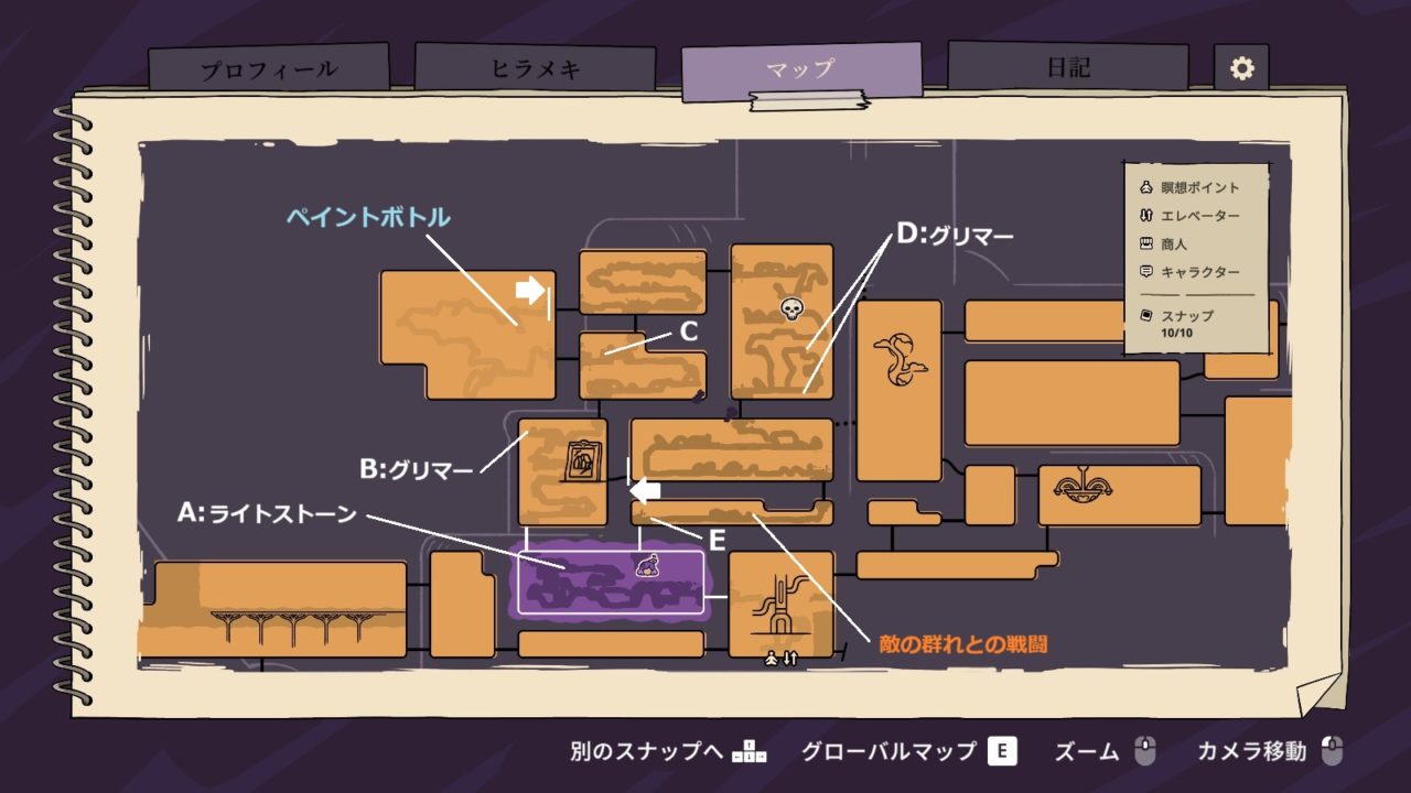 D:ダイブダッシュで隠し通路を通った先で「スナップ」を入手できる。